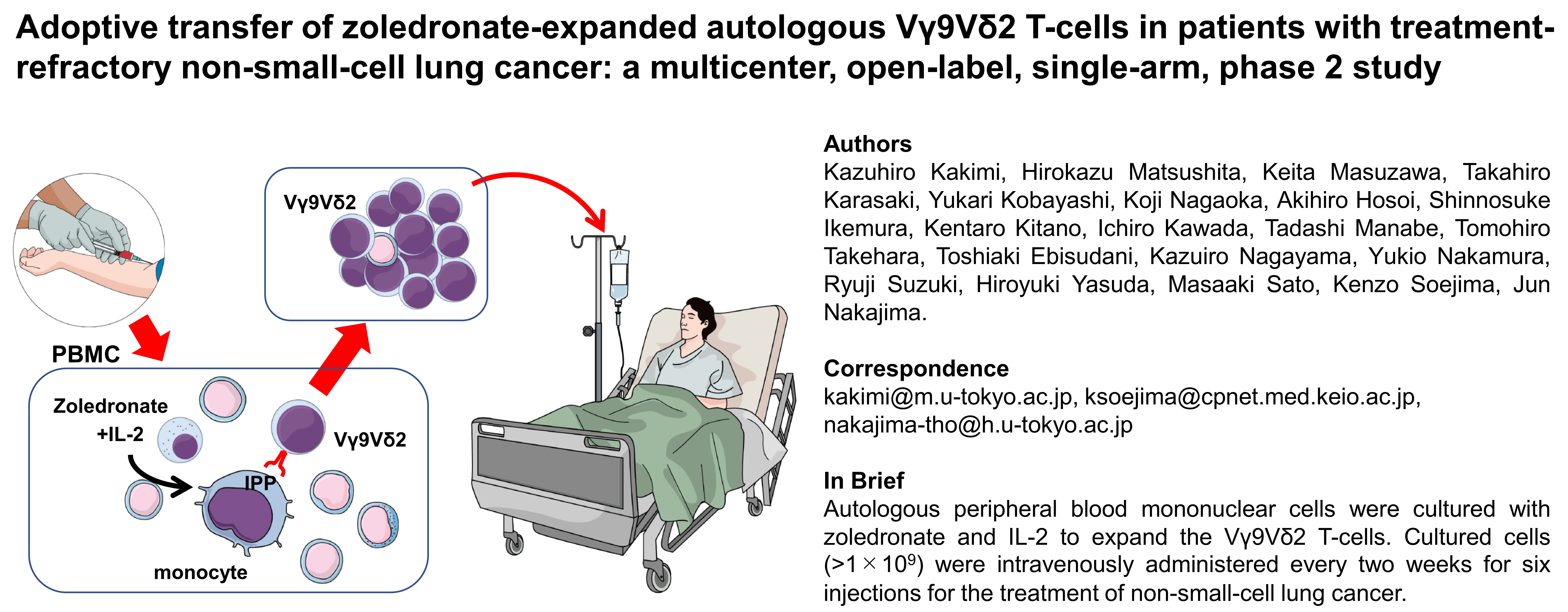 肺がんに対するγδT細胞治療の結果をアメリカがん免疫学会誌(Journal for ImmunoTherapy of cancer)に発表しました。試験に参加してくださった患者さんとそのご家族、東大病院、慶応病院はじめ連携してくださった多くの病院の先生やスタッフの皆様に感謝いたします。
