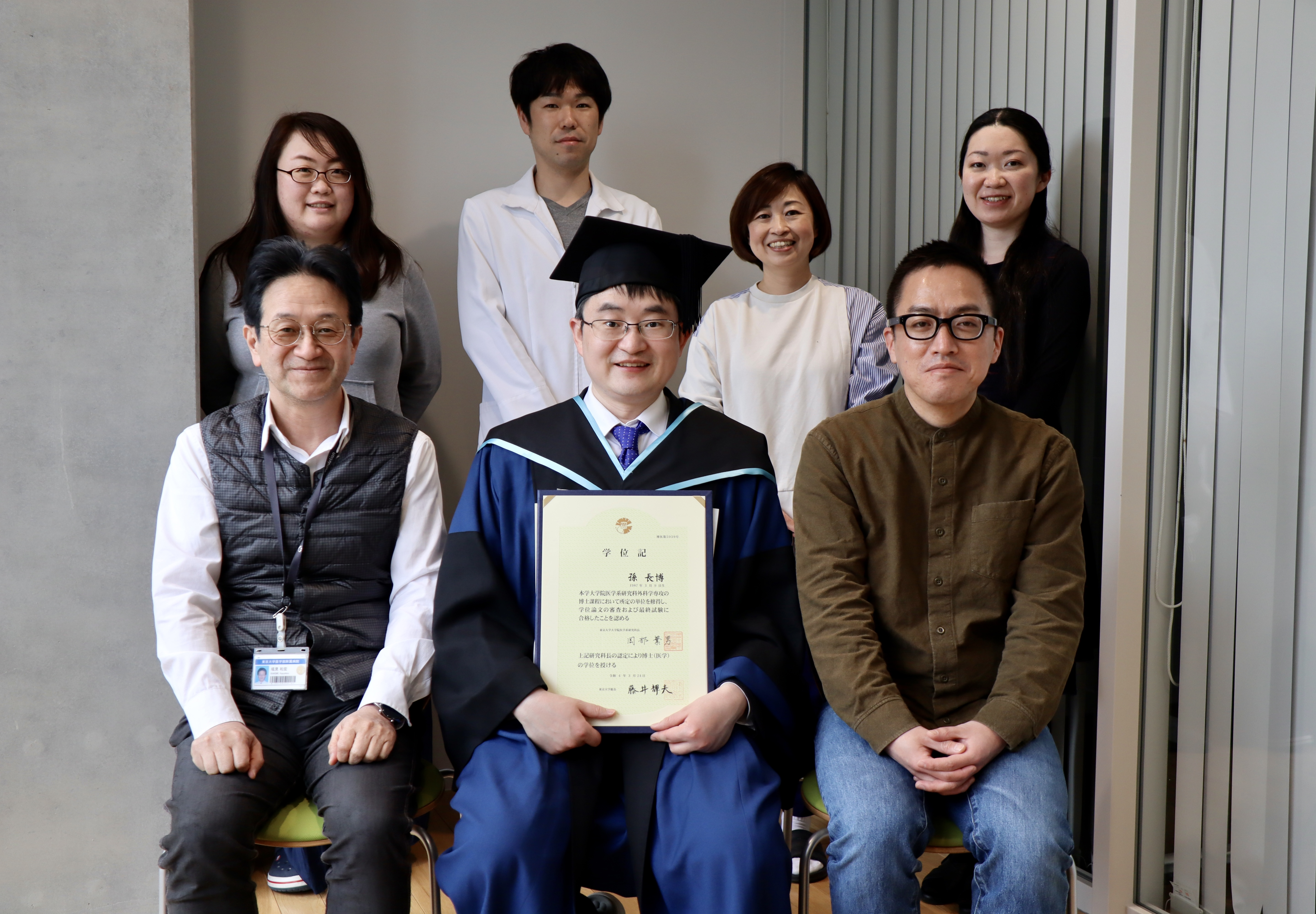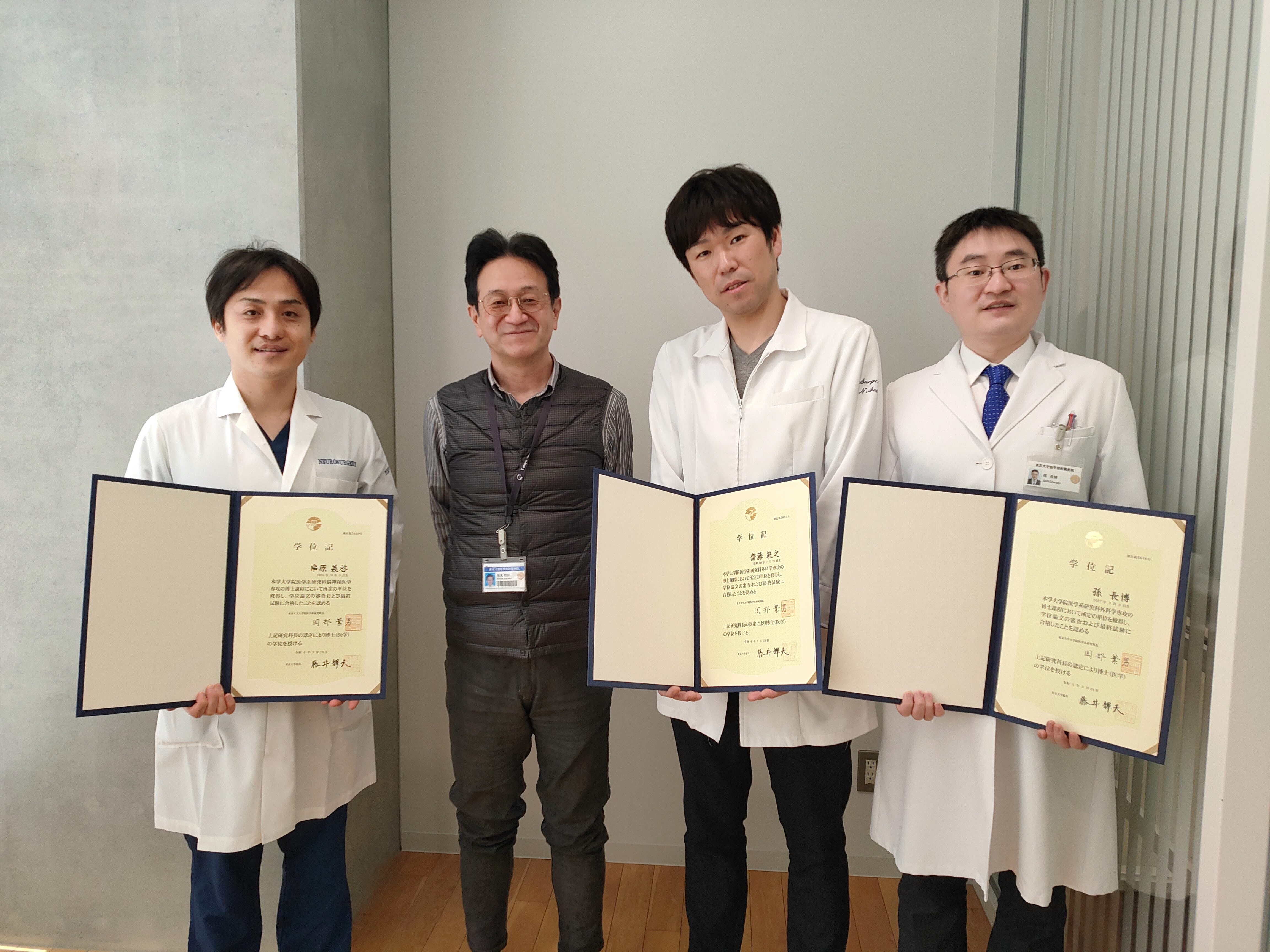 串原義啓(脳神経外科)、齊藤範之(胃食道外科)、孫長博(呼吸器外科)の3名の大学院生が、無事学位を取得し、修了しました。またこれからの道をそれぞれ頑張ってください。活躍を期待しています。