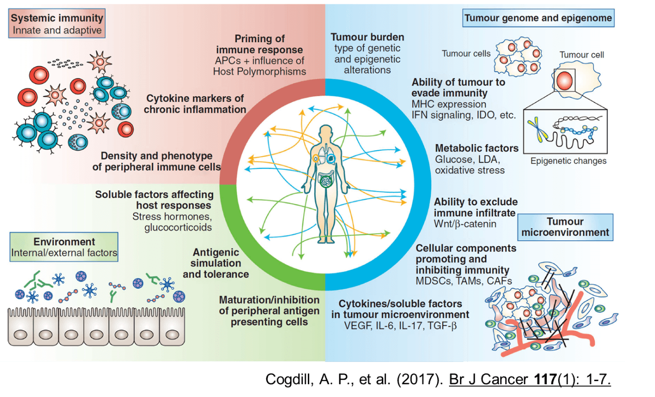 全身の免疫状態、腫瘍のゲノム、エピゲノム、腫瘍微小環境、そして環境因子など、非常に多様な因子が複雑に関与している。個々の患者において、これらの因子が異なることから、これからのがん治療では、一人ひとりの患者において、このような免疫抑制因子を同定することが求められている。
