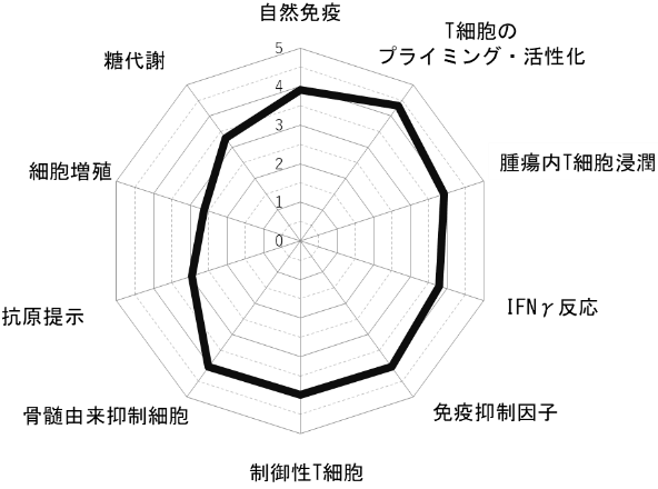 我々は、これまでに蓄積された腫瘍免疫学に基づくKnowledge-basedのバイオマーカーとして、網羅的遺伝子解析データの中から、がん免疫サイクルの各ステップに関連する因子について、それに関わる遺伝子群の発現データを抽出してスコア化し、レーダーチャートを用いて可視化するがんイムノグラム(Cancer Immunogram)解析を構築した。イムノグラムの軸として,がん免疫サイクルの各ステップの評価に加えて、がん免疫相互作用を反映するために、腫瘍の増殖・代謝にかかわる因子を加えた。また、各軸が治療介入の指標となるように、1)自然免疫、2)T細胞のプライミング・活性化、3)腫瘍内T細胞浸潤、4)IFNγ反応、5)免疫抑制因子、6)制御性T細胞、7)MDSC、8)抗原提示、9)細胞増殖、10)糖代謝からなる10の軸を設定した。これにより、がんイムノグラムは,末梢血から腫瘍細胞・腫瘍周囲環境までの腫瘍免疫の全体像を評価することが可能であり,今後がん種や治療法などに応じて,評価する軸を増やしていくことで,免疫チェックポイント阻害薬を含む免疫療法の効果を個別に予測するあらたなバイオマーカーとなりうる可能性を秘めている。
